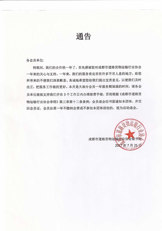 转眼间,我们的合作快一年了,首先感谢您对成都市道路货物运输行业协会一年来的关心与支持。一年来,我们的服务肯定存在许多不尽人意的地方,给您所带来的不便我们深表歉意。真诚地希望您给我们提出宝贵意见,以便我们及时改正,把服务工作做的更好。本月是大部分会员一年服务期届满的时间,请各会员单位继续支持我们并在3个工作日内办理续费手续,否则根据《成都市道路货物运输行业协会章程》第三章第十二条条例:会员退会应书面通知本团体,并交回会员证,会员如果一年不缴纳会费或不参加本团体活动的,视为自动退会。